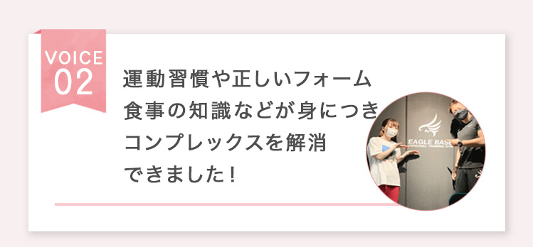 コロナ禍でテレワークになり完全に運動不足でしたが、こちらに通うことで運動習慣や正しい筋トレのフォーム、食事の知識が身につき、何より体重を増やすことが出来たのでとても感謝しています。