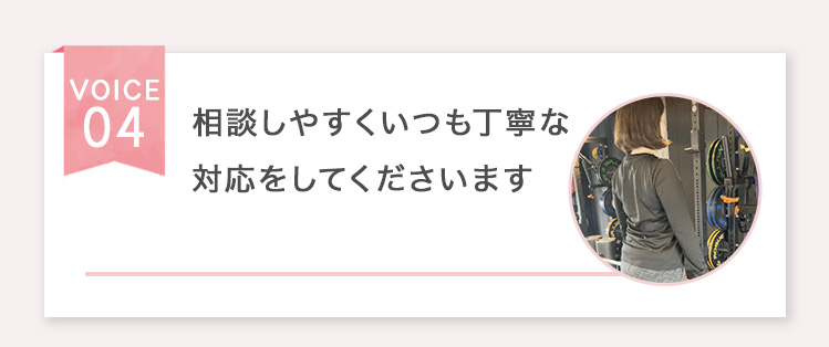 トレーニング中のサポートが優しくてつい我慢してしまう私でも、オーバーワークなる前に察していただけるので筋トレ初心者の私にとっては安心できます。予算が限られている私でも、無理無く続けられるプランをご提案してくださいます。