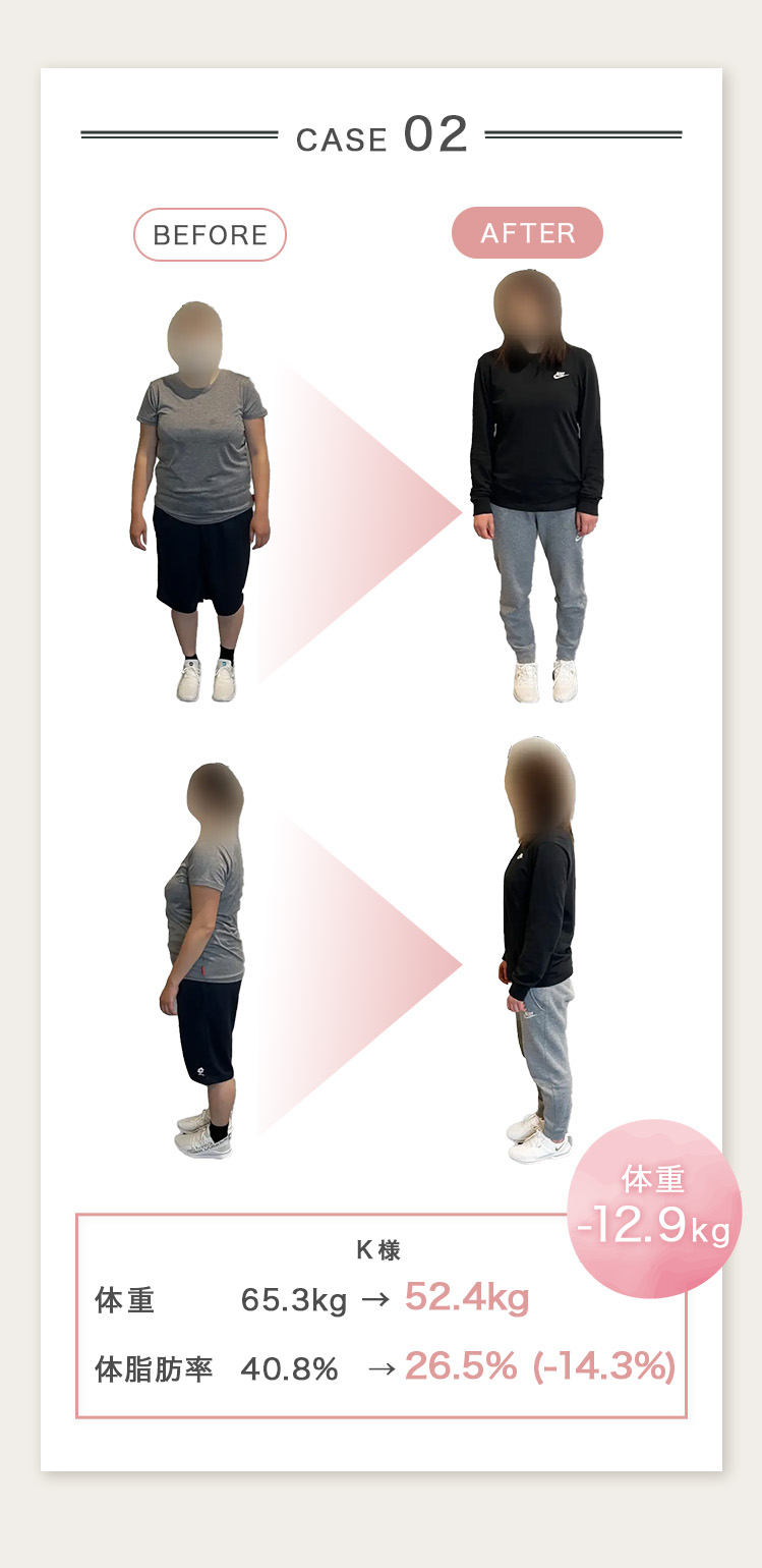 減量が停滞しているときにも「こういう減らし方もあります」など親身に相談に乗ってくれとても感謝しています。