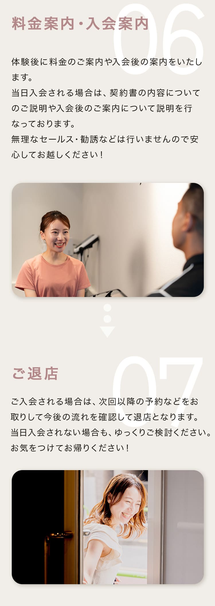 体験に伺った際にはどういう食生活なのか普段よく摂取するものや今後の食生活トレーニング中の飲み物やお勧めのプロテイン等も教えてくれ、他にはない丁寧さを感じました。