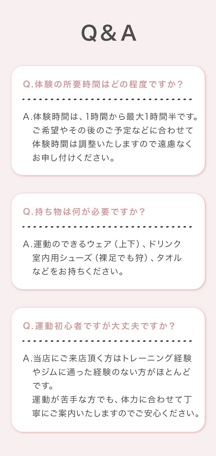 普通のジムでもいいのではないかYouTubeで筋トレ動画など見て自己流で筋トレをしたことがありますが、こちらのジムでしっかり正しいフォームを学んでからはトレーニングのキツさや効き方が全く違い、初心者は絶対にパーソナルから始めた方がいいと思いました!